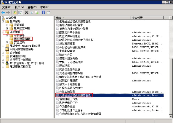 - 打開"本地策略 > 用戶權限分配 > 允許通過遠程桌面服務登錄"。