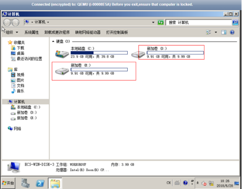 以使用Windows 2008鏡像的云主機為例,假設變更規格前,云主機掛載有1塊系統盤、2塊數據盤,如下圖所示。