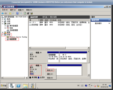 c. 在左側窗格中出現磁盤列表,分別右鍵單擊脫機的磁盤,并選擇“聯機”,將脫機磁盤進行聯機。