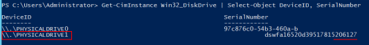 Get-CimInstance Win32_DiskDrive | Select-Object DeviceID, SerialNumber