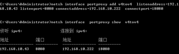 netsh interface portproxy add v4tov4 listenaddress=192.168.10.43 listenport=8080 connectaddress=192.168.10.222 connectport=18080