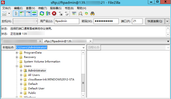 - 在Windows本地主機打開 FileZilla,填寫待連接的云主機信息,單擊“快速連接”。