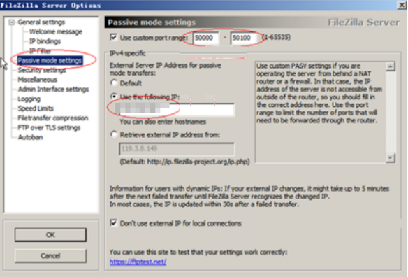 - 選擇“Passive mode settings”,設置數據傳輸端口范圍(如50000-50100),并填寫彈性公網IP。