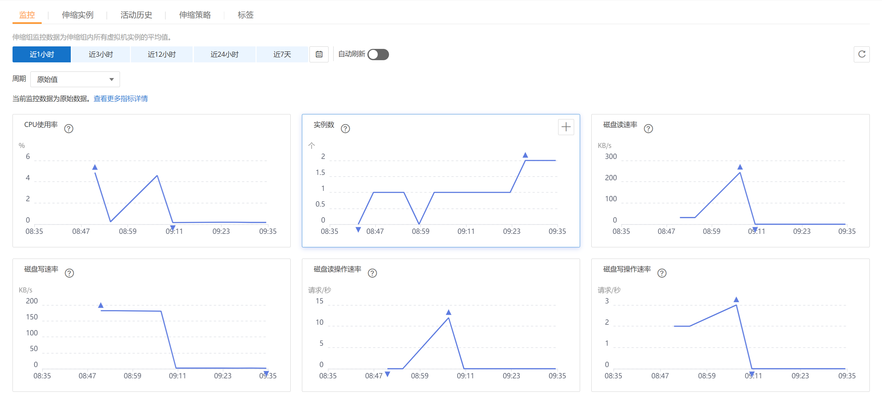 - 在【伸縮組詳情頁】,單擊在【監控】頁簽中,展示伸縮活動詳情。可以查看實例數量、CPU使用率等監控指標的變化情況。