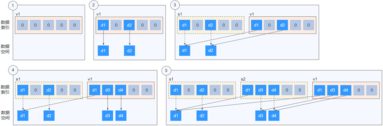 ● 為2修改后的云硬盤v1創建快照s1,此時并不會去另存一份數據d1和d2,而是建立快照s1與數據d1和d2的關聯關系。