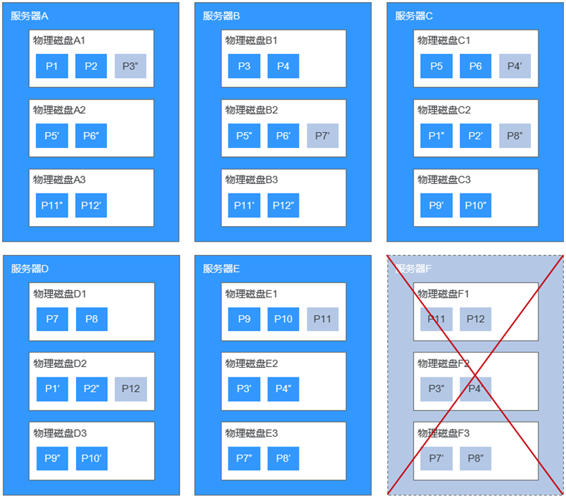 數據重建原理如下圖所示,例如當集群中的服務器F硬件發生故障時,物理磁盤上的數據塊會在其他節點的磁盤上并行重建恢復。