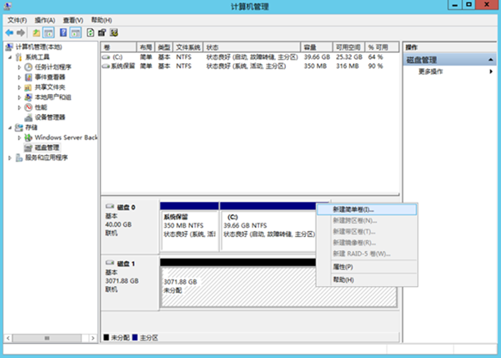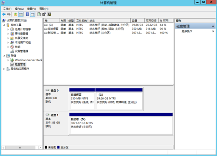 本文以云主機的操作系統為“Windows Server 2012 R2 Standard 64bit”、磁盤容量為3 TB舉例,提供容量大于2 TB的Windows數據盤的初始化操作指導。