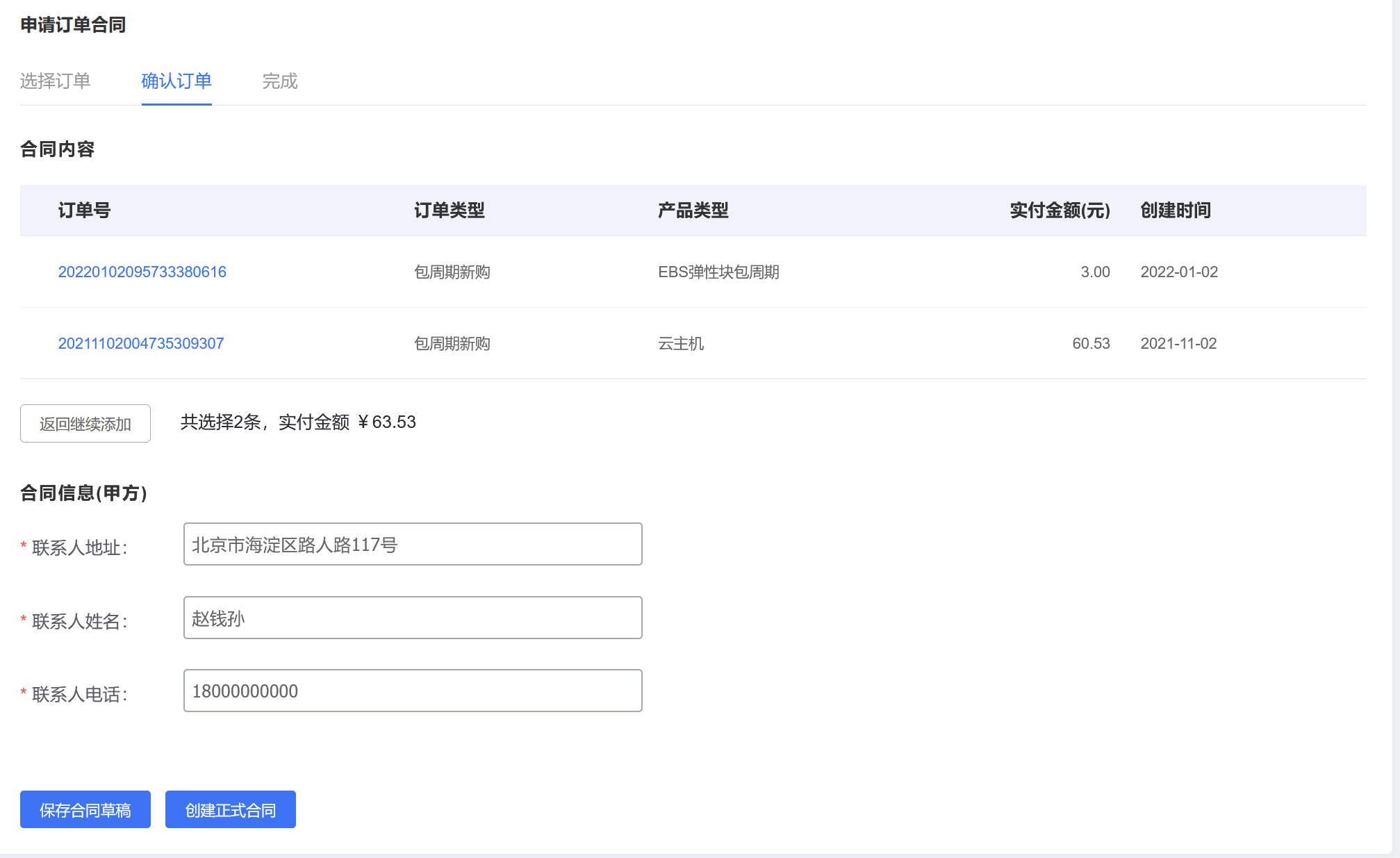 確認要申請合同的訂單,并添加您的合同信息。此信息即作為聯系人地址、聯系人姓名、聯系人電話。甲方抬頭系統默認為您的實名認證名稱。