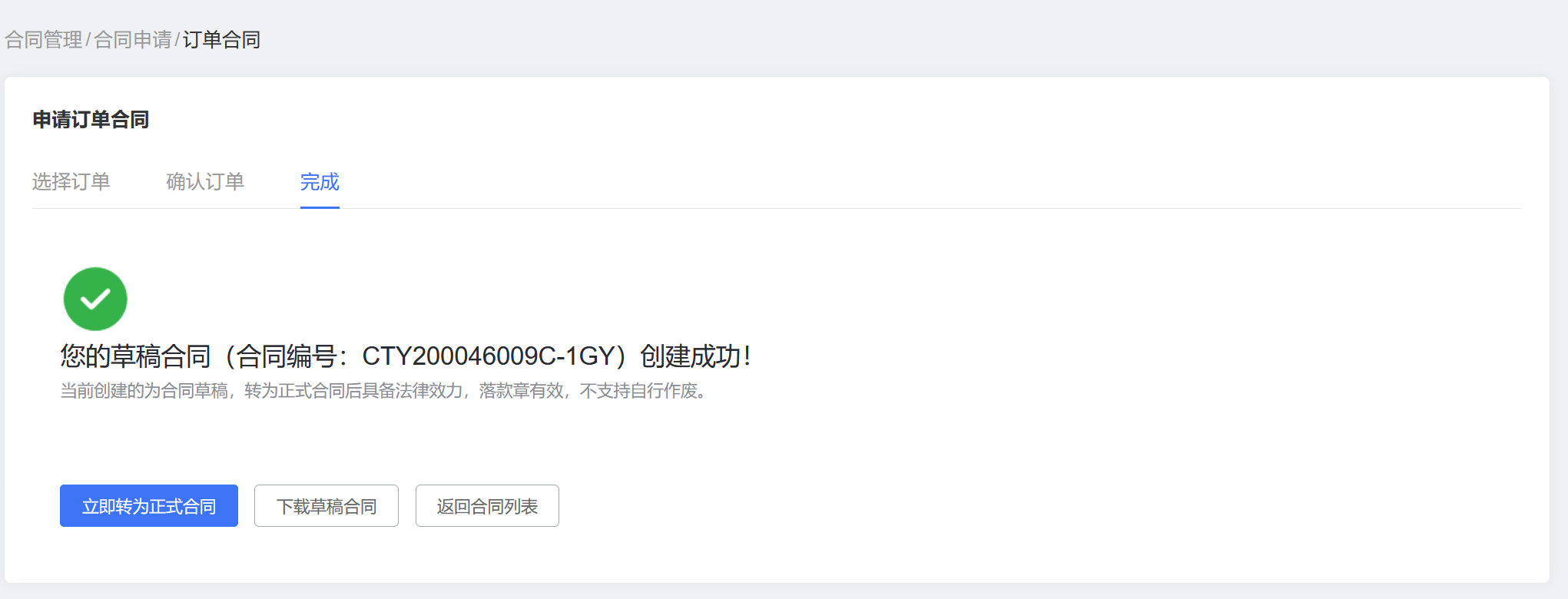 已完成:草稿合同轉為正式合同后,系統自動加蓋電子簽章,狀態為“已完成”。正式合同具有法律效力。