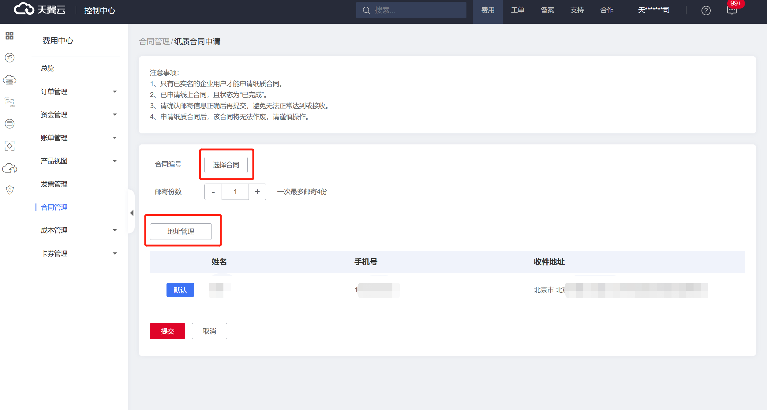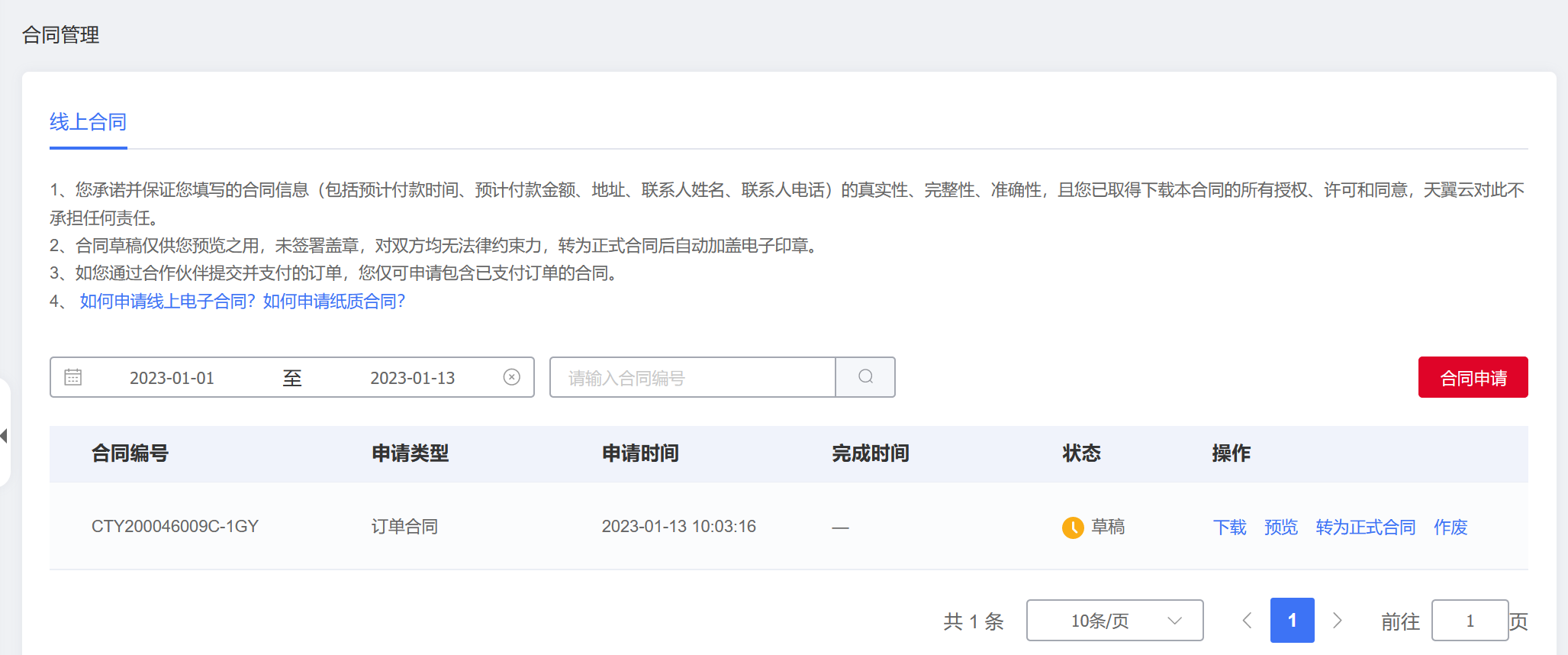登錄官網,在首頁點擊“管理中心-費用-發票與合同”,選擇進入“合同管理”頁面,可執行以下操作申請訂單合同: