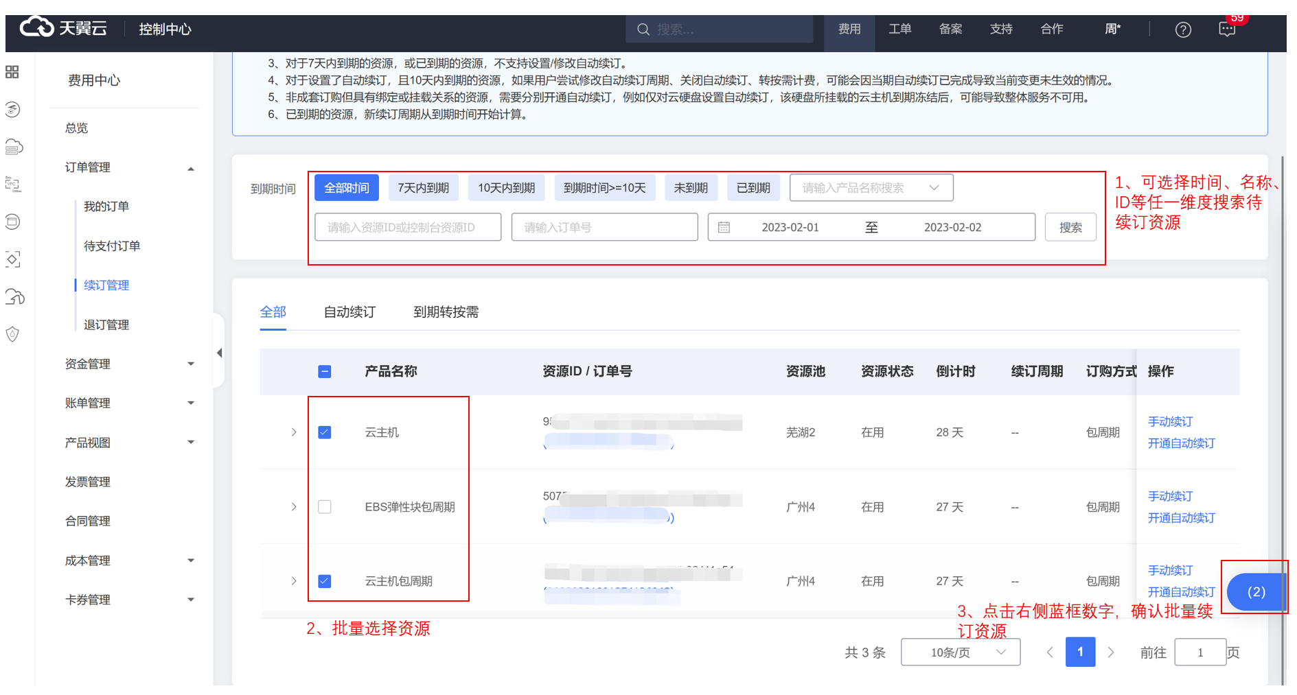 1、進入費用中心-訂單管理-續訂管理頁面,通過資源到期時間、產品名稱等篩選或搜索,找到并勾選所需續訂的多個資源。