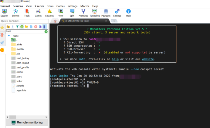 2.SSH連接配置好后(hou),輸入登(deng)錄用(yong)戶和密碼,連接上ECS。登(deng)錄后(hou)輸入TMOUT=0,避免連接超(chao)時自動(dong)關閉。