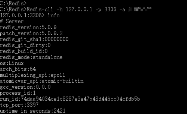 Redis-cli -h 127.0.0.1 -p 3306 -a {password}