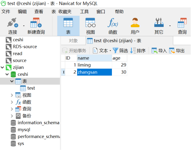 5、通過Navicat登錄主機搭建好的數據庫并新建測試表格數據