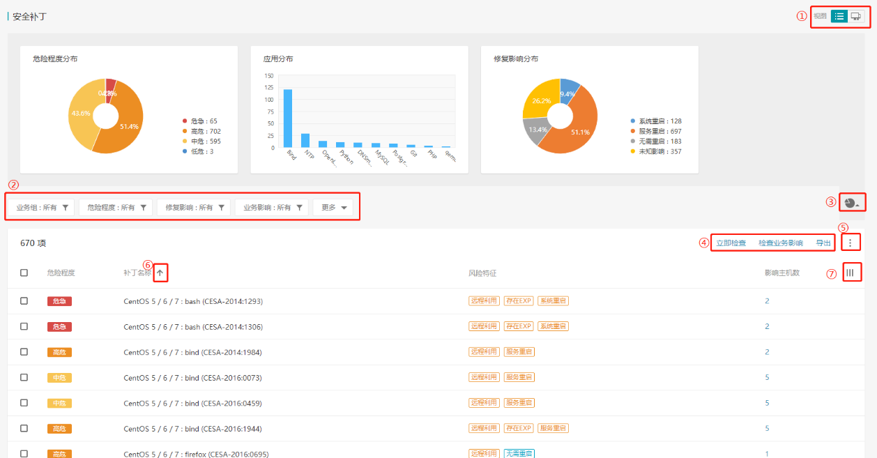 下面以安全補丁界面為例,進行通用功能介紹,各功能詳情,請登錄服務器安全衛士控制臺進行查看。