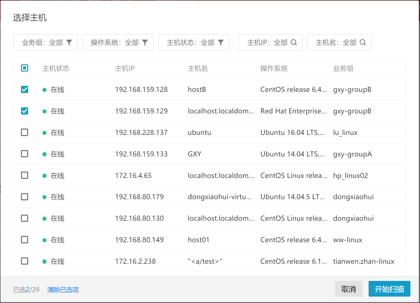 提供以下幾類掃描方式:全部掃描、按業務組掃描、按主機IP掃描。