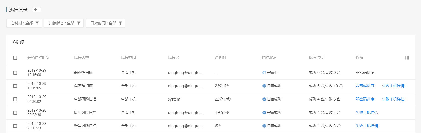 總覽界面提供對執行的各類風險掃描查看其執行情況。點擊總覽界面中的“更多”按鈕,選擇“查看執行記錄”,可查看執行記錄列表。
