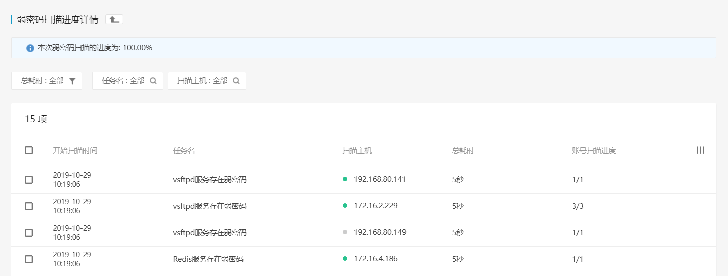 弱密碼額外提供對進度的查看,點擊執行內容為弱密碼掃描記錄中的“弱密碼進度”按鈕,可查看弱密碼執行進度情況。
