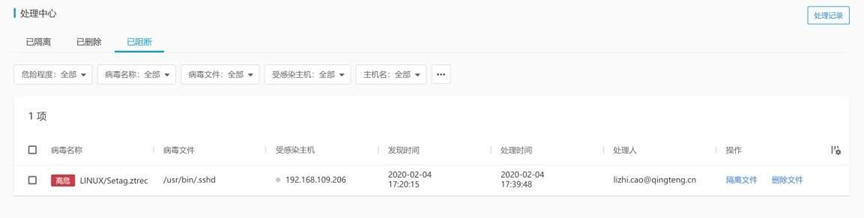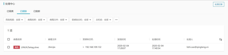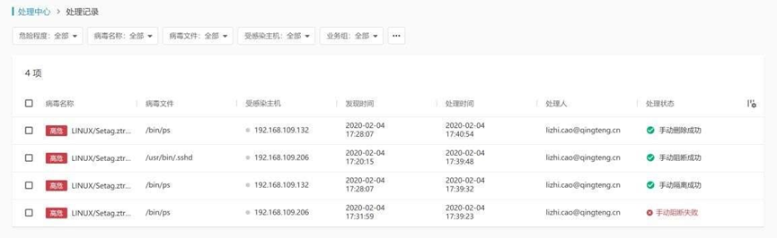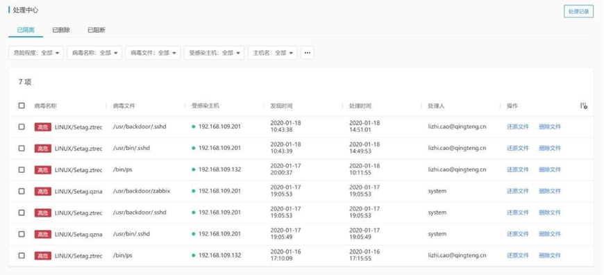 可查看和管理已經處理成功的病毒文件,并支持查看每一次對病毒文件的處理操作記錄。