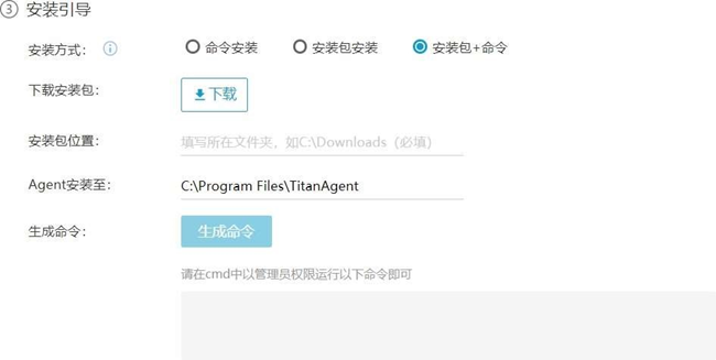 需下載安裝包,輸入安裝包所在位置和 Agent 安裝到的目錄位置(默認為: C:\Program Files\TitanAgent),才可生成安裝命令;生成命令后,在 cmd 中以管理員權限運行命令,即可安裝 Agent。