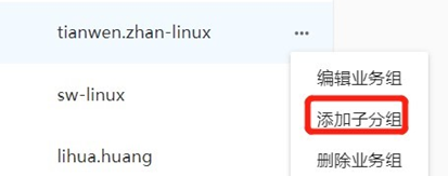 鼠標移動到要添加子分組的業務組那一行,右側出現