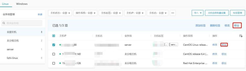 可以單擊操作那一欄中的“移出”按鈕,移動某個主機所屬業務組;也可以勾選復選框,點擊右上角“移出”,批量移動主機的所屬業務組。