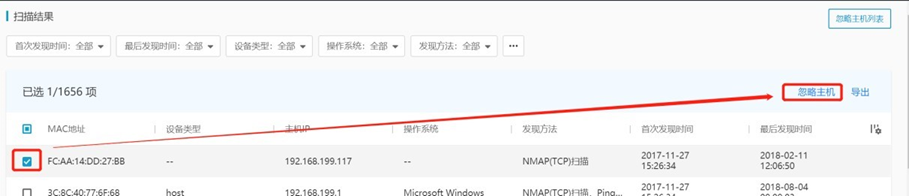 加入到忽略主機列表后的主機將不再出現在發現主機列表中,已忽略的主機,可以在忽略主機列表界面取消忽略。