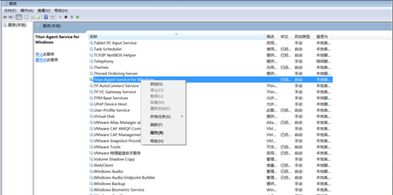 Windows系統環境下,打開服務管理器,找到Titan Agent Service for Windows服務,右擊該服務,即可對Agent進行啟動、停止和重新啟動操作,如下圖: