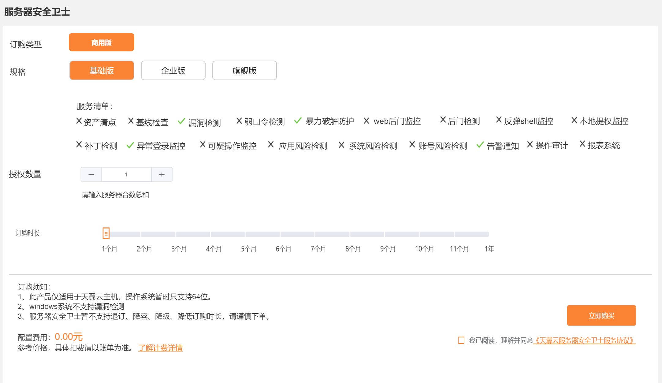 2.選擇規格、授權數量和訂購時長,提交訂單,購買成功后即可進入控制中心-“服務器安全衛士”界面進行后續操作。