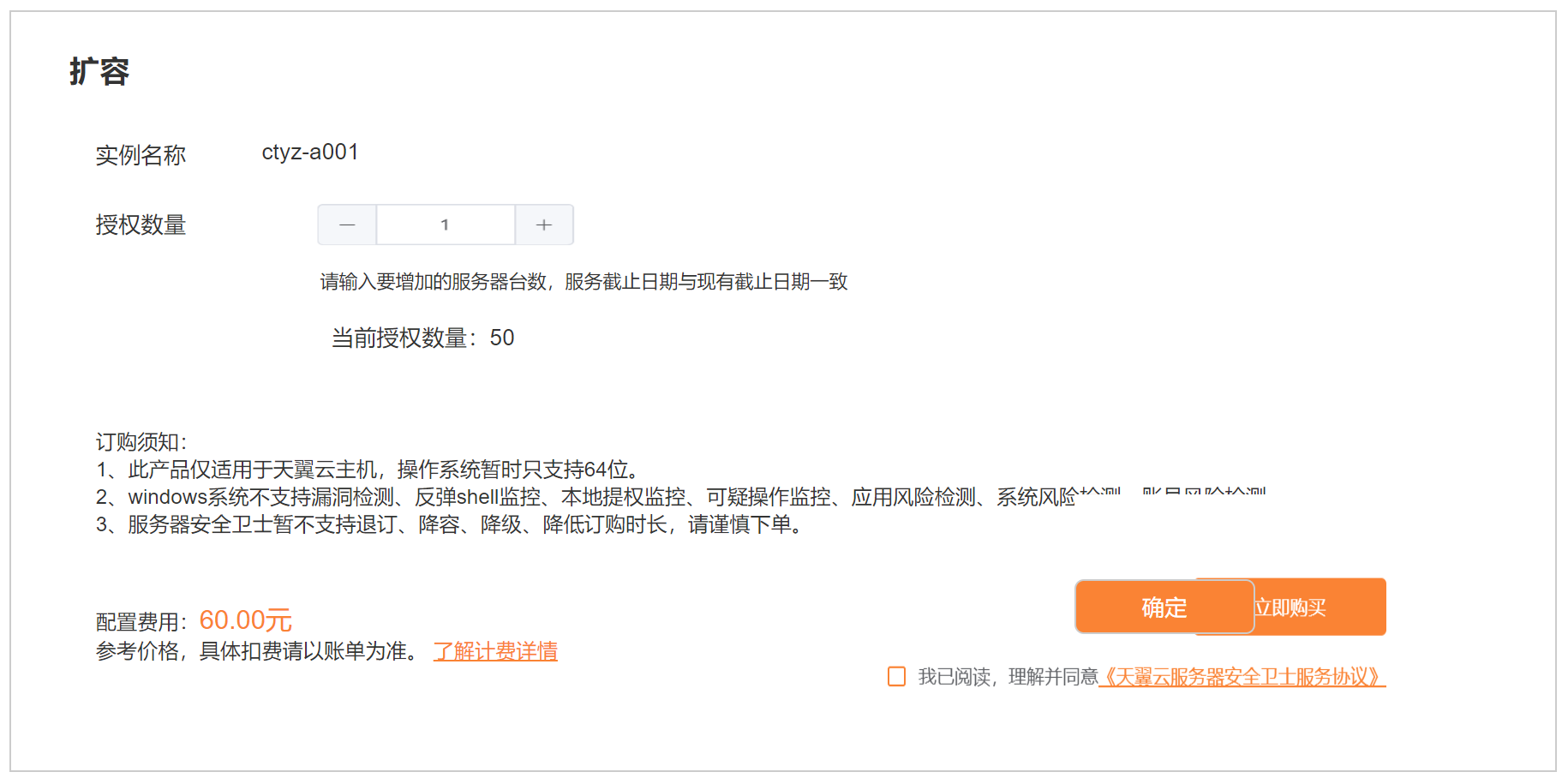 1.登錄云平臺,進入控制中心-“服務器安全衛士”界面,點擊需要擴容訂單對應的“擴容”按鈕,進入擴容頁面。