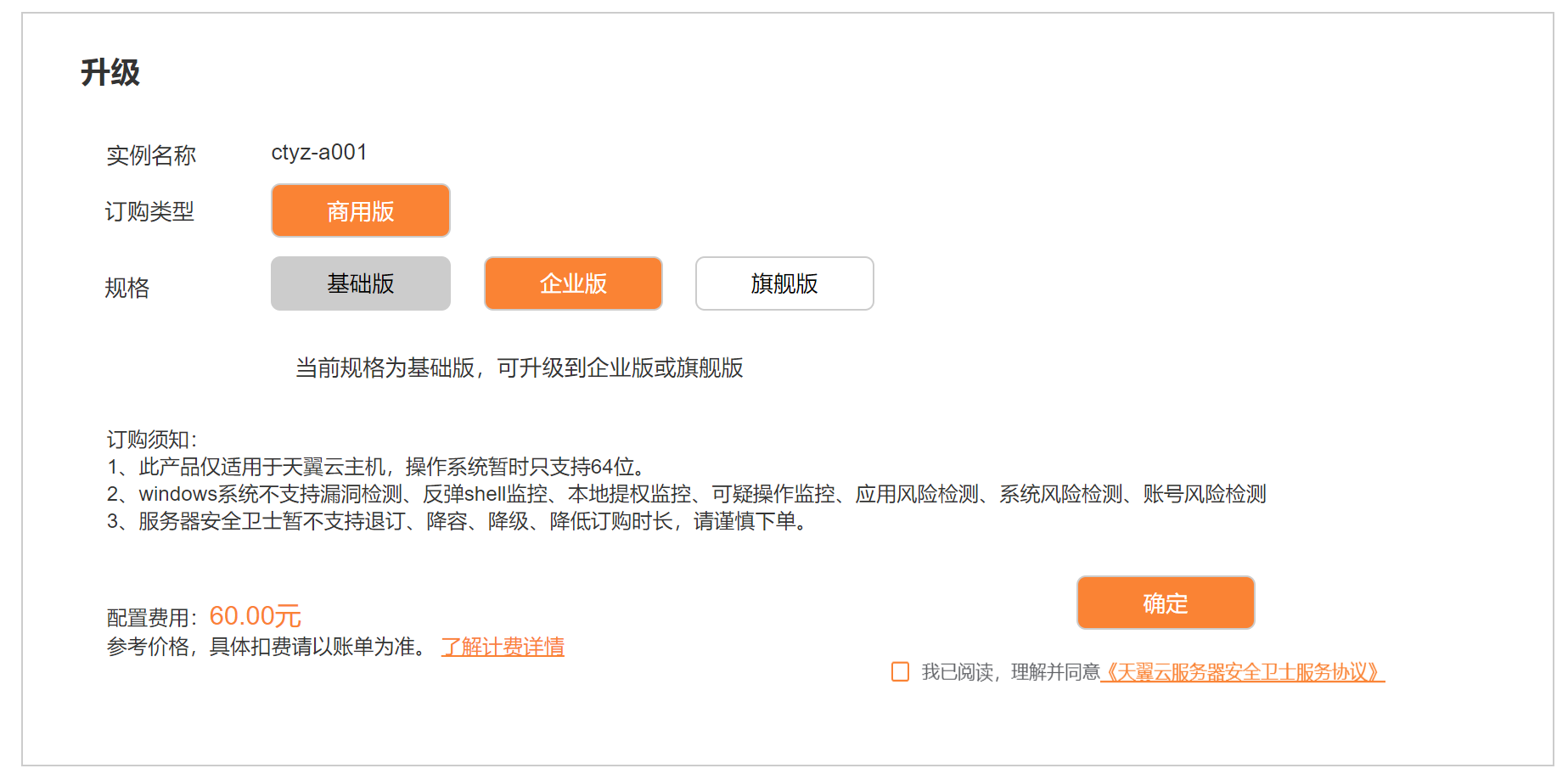 - 當該訂單規格為基礎版時,點擊“升級”,彈出開通服務界面,規格默認“企業版”,可切換規格為“旗艦版”。