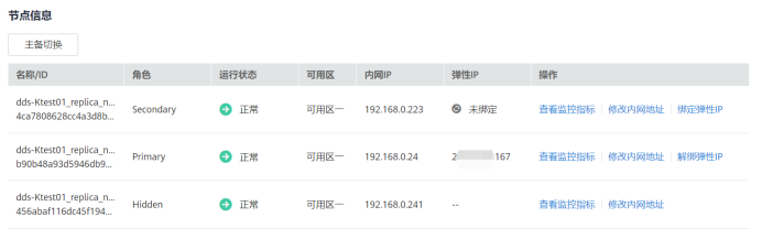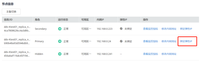 3.在實(shi)例“基本信息”頁(ye)面的(de)“節點信息”模塊,選擇角色為Primary的(de)節點,單(dan)擊“綁(bang)定彈(dan)性IP”。
