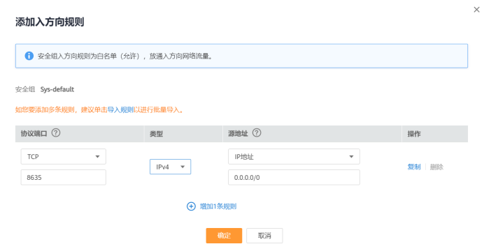 4.選擇“入方向規則(ze)”頁簽,單(dan)擊“添加規則(ze)”,在(zai)彈出窗(chuang)口(kou)中,添加端口(kou)為數據庫(ku)端口(kou)的入方向規則(ze)。