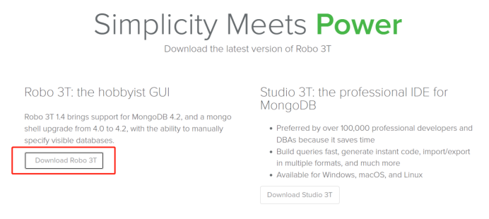 1.打開Robo 3T下載地址://robomongo.org/download,單擊(ji)“Download Robo 3T”。