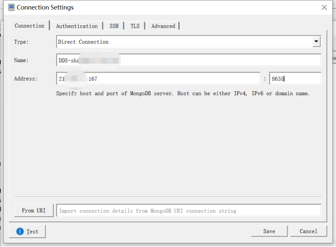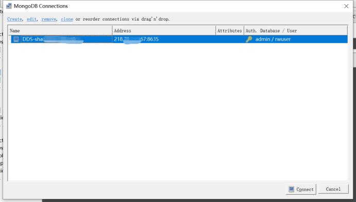 a.在“Connection”頁簽,“Name”填(tian)寫新建連接的(de)(de)名稱,“Address”填(tian)寫DDS實例(li)(li)綁定(ding)的(de)(de)彈性IP和實例(li)(li)的(de)(de)數據庫端口(kou)。