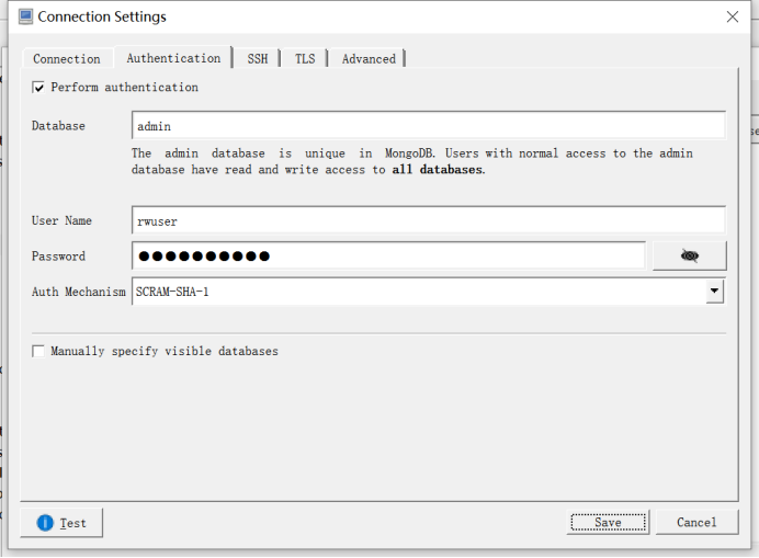 b.在“Authentication”頁簽,“Database”填(tian)(tian)寫admin,“User Name”填(tian)(tian)寫rwuser,“Password”填(tian)(tian)寫您創建DDS實例時設置的管理員密碼。