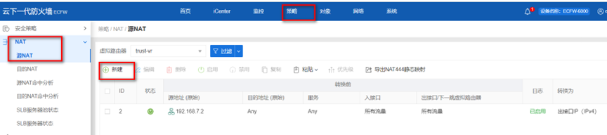 1.打開菜單欄,【策略→NAT→源NAT】,新建策略。