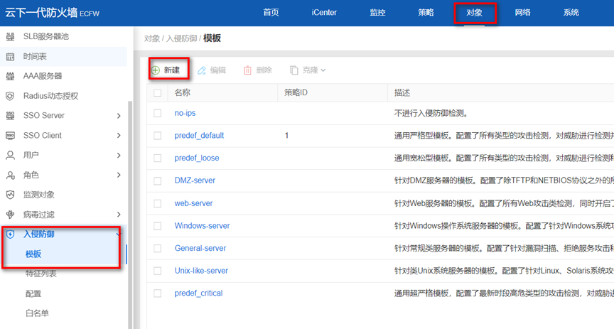 1.打開菜單欄【對象→入侵防御→模板→新建】。
