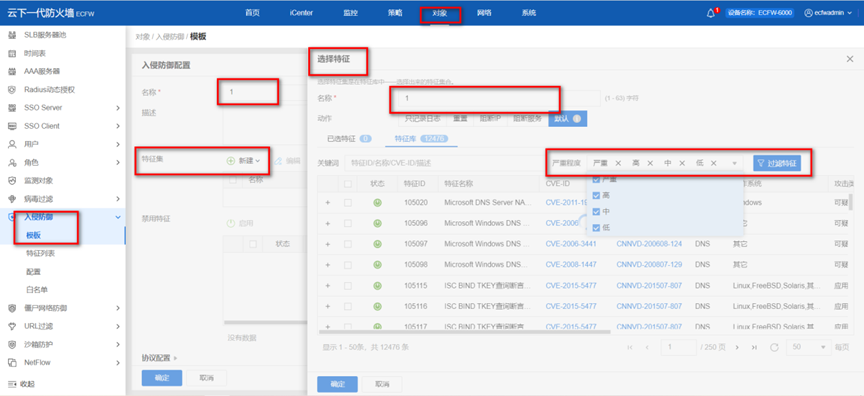 2.新建策略模板,選擇特征,以嚴重程度劃分過濾。