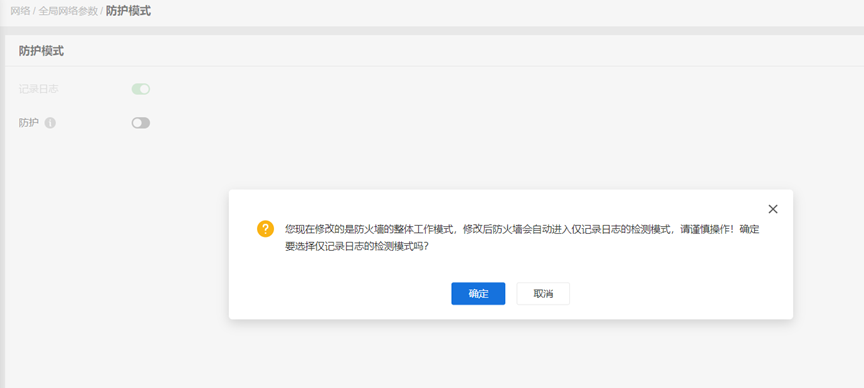 關閉防護功能僅需要針對全局網絡參數做修改,關閉【防護】后會從系統層面進入僅監測模式,威脅日志全部顯示為僅檢測,無法做攔截。