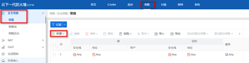 1.打開菜單欄,【策略→安全策略→策略→新建策略】。