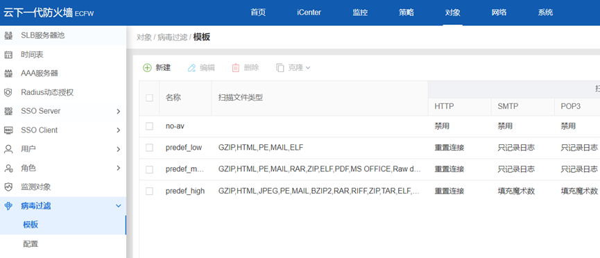 1.打開菜單欄【對象→病毒過濾→模板→新建】。