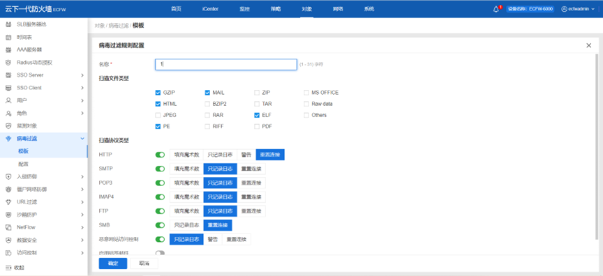入侵防御策略需提前設置把病毒過濾模板,為后期調用做準備。