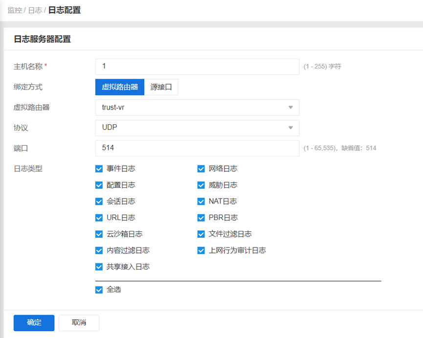 打開菜單欄,【監控→日志→日志配置→日志服務器配置→新建】,選擇發送的日志類型及使用端口及協議,主機名稱為日志服務器IP地址。