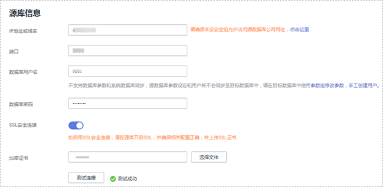 說明源數據庫IP地址、端口、用戶名和密碼將在同步過程中被加密暫存到數據庫和同步實例主機上,待該任務刪除后會永久清除。