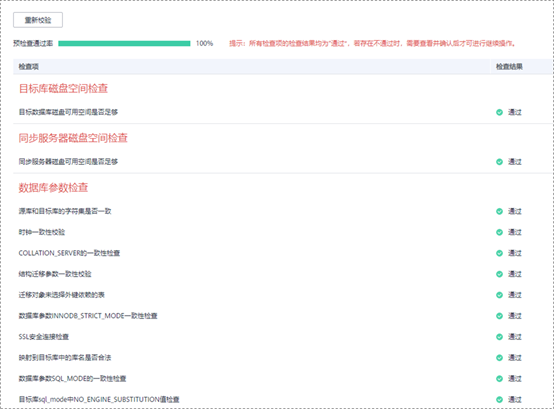 預檢查不通過項處理建議請參見《數據庫復制服務用戶指南》中的“預檢查不通過項修復方法”。