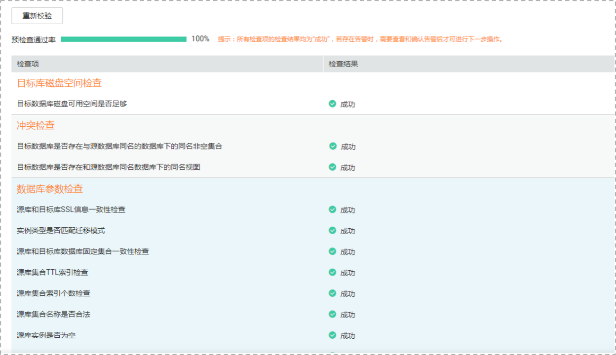說明所有檢查項結果均成功時,若存在告警,需要閱讀并確認告警詳情后才可以繼續執行下一步操作。