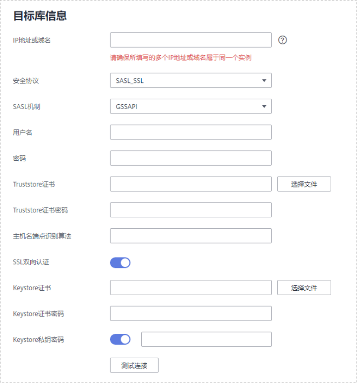 | Keystore證書密碼 | SSL雙向認證開啟可見,SSL雙向認證證書對應的秘鑰。 |
