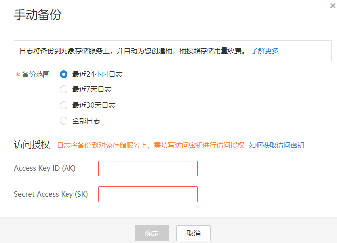 - 單擊“手動備份”,在彈出的對話框中,選擇“備份范圍”并設置訪問密鑰的AK和SK,如下圖所示。
