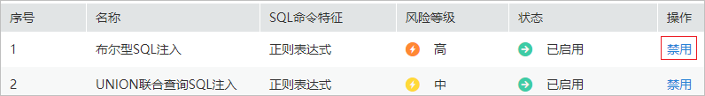 - 在SQL注入檢測規則所在行的“操作”列,單擊“禁用”,如下圖所示。